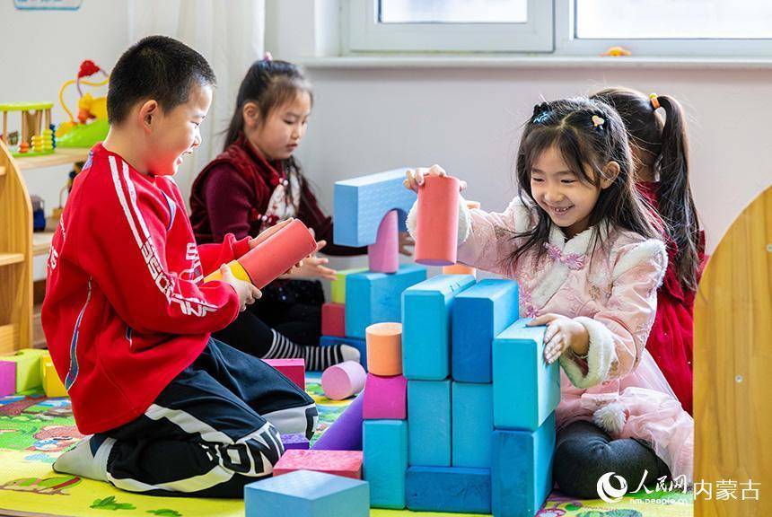 在呼和浩特市玉泉区秋实社区,相干托管的学生在沿途玩积木。丁根厚摄