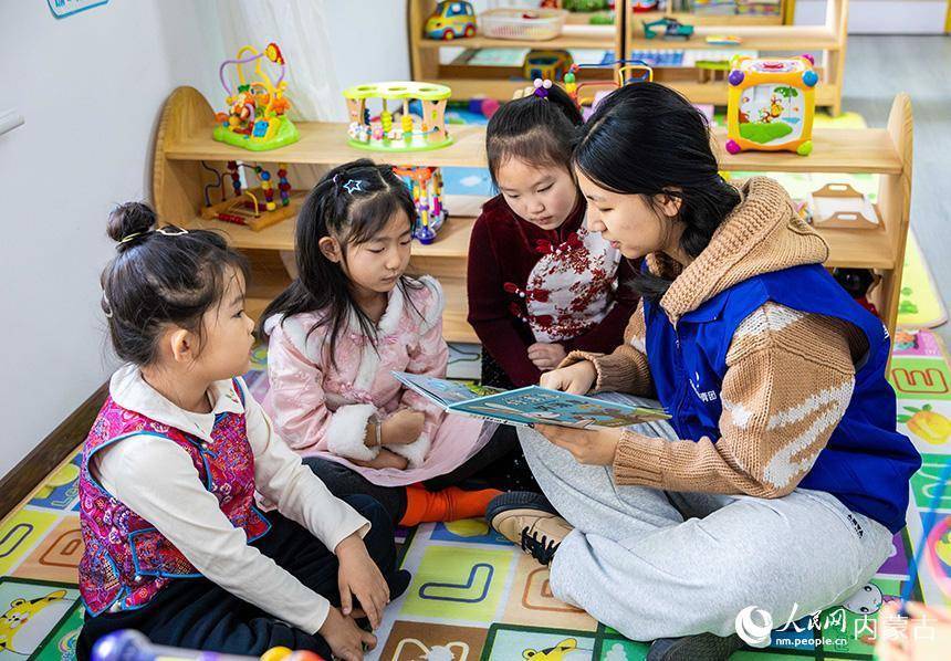 在呼和浩特市玉泉区秋实社区,后生志愿者为相干托管的学生读绘本故事。丁根厚摄