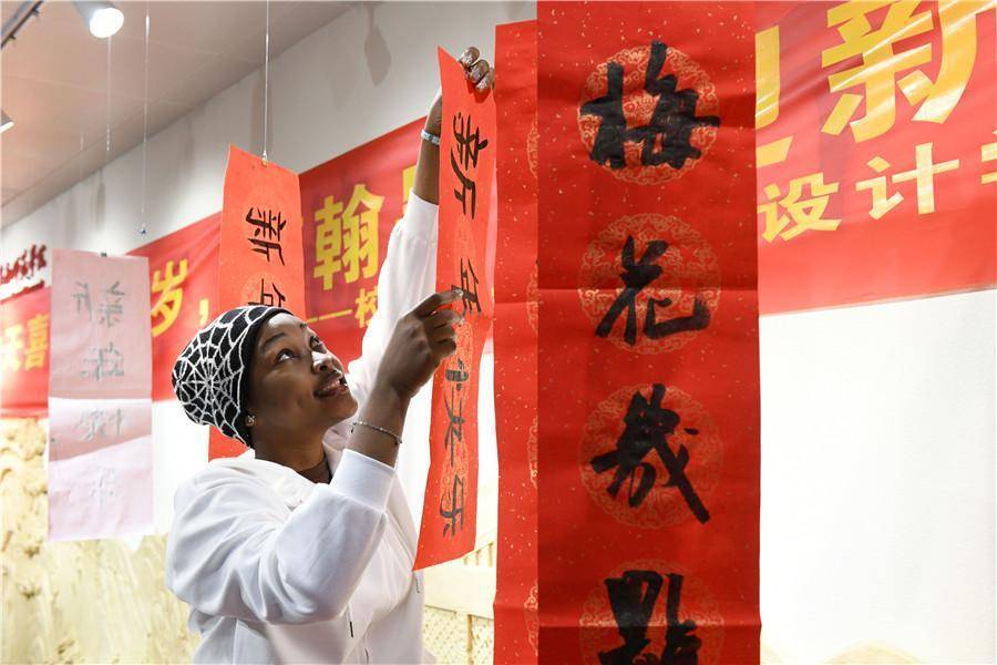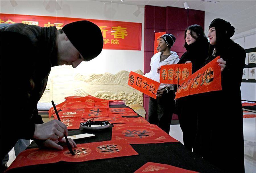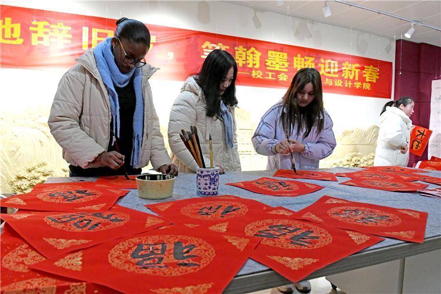 留学生在书道素养斥地下体验写“福”字和对联。2026年1月27日云开体育,安徽淮南师范学院留学生在书道素养斥地下体验写“福”字和对联。新春独揽,各地举行写对联、写“福”字行径,各高校留学生积极参与迎新春行径,体验写“福”字和对联,感受中华优秀传统文化魔力。(陈彬 文/图)