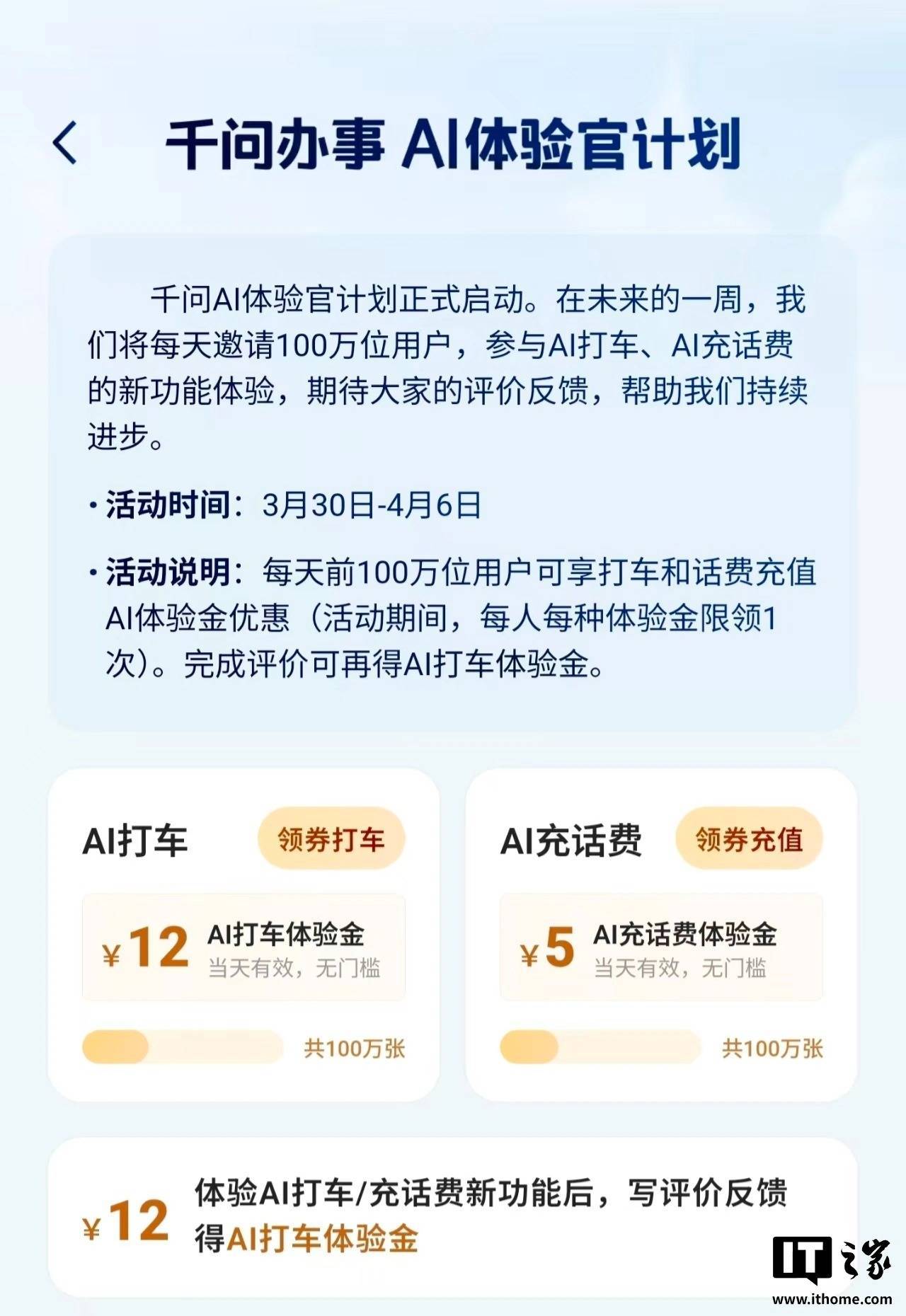 IT之家实测,掀开千问 App,点击左上角“千问干事”,即可领取 12 元 AI 打车体验金以及 5 元 AI 充话费体验金。用户说出充值条款,如“帮我手机充 50”即可立减 5 元。