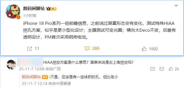 【CNMO科技讯息】11月7日,凭据数码博主的爆料开yun体育网,iPhone 18 Pro系列将取消“灵动岛”打算,现在正在测试HIAA挖孔决策。该博主称,HIAA决策是比拟于灵动岛更小的挖孔打算。