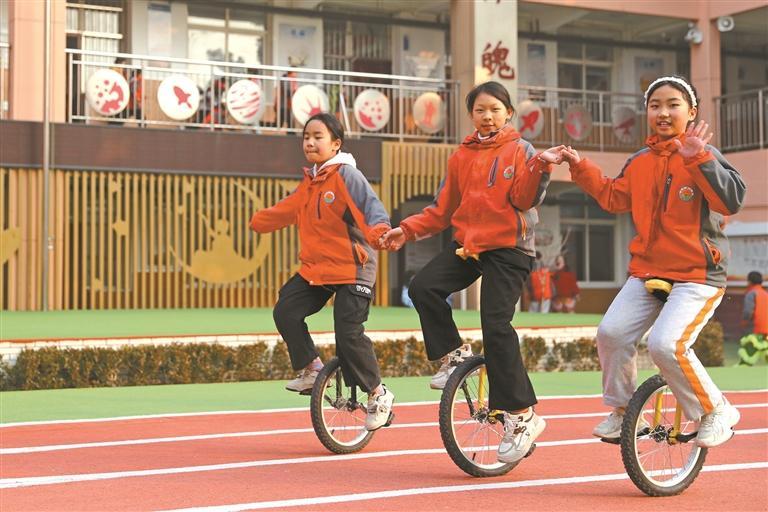 独轮车上自若骑行、少儿五禽戏别开生面、“非遗”醒狮摆动校园……每天上昼、下昼参半小时的体育大课间,在各个学校的操场上,学生开释天性,找到了“欢乐时光”。